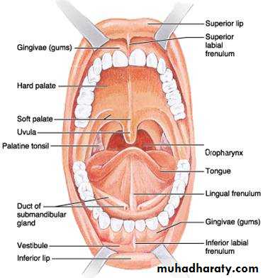 The vestibule lies between the lips and the cheeks externally and between the gums and the teeth internally. This slit like space communicates with the exterior through the oral fissure between the lips. When the jaws are closed, it communicates with the mouth proper behind the third molar tooth on each side .. The vestibule is limited above and below by the reflection of the mucous membrane from the Iips and cheeks to the gums. The lateral wall of the vestibule is formed by the cheek, which is made up by the buccinators muscle and is lined with mucous membrane. The tone of the buccinators muscle and that of the muscles of the lips keep's the walls of the vestibule in contact with one another. The duct of the parotid salivary gland opens on a small papilla into the vestibule opposite the upper second molar tooth.