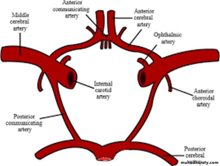 The circle of Willis lies in the subarachnoid space at the base of the brain. It is formed by the anastomosis between the branches of the two internal carotid arteries and the two vertebral arteries. The anterior communicating, anterior and posterior cerebral, and posterior communicating are all arteries that contribute to the circle.Cortical and central branches arise from the circle and supply the brain.