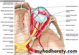 1. The vertebral artery ascends in the neck through the foramina in the transverse processes of the upper six cervical vertebrae. It passes medially above the posterior arch of the atlas and then ascends through the foramen magnum into the skull. On reaching the anterior surface of the medulla oblongata of the brain at the level of the lower border of the pons, it Joins the vessel of the opposite side to form the basilar artery .The basilar artery ascends in a groove on the anterior surface of the pons. It gives off branches to the pons, the cerebellum, and the internal ear. It finally divides into the two posterior cerebral arteries. On each side, the posterior cerebral artery curves laterally and backward around the midbrain.