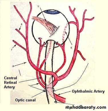 The ophthalmic artery arises from the internal carotid artery as it emerges from the cavernous sinus . It passes forward into the orbital cavity through the optic canal, and it gives off the central artery of the retina, which enters the optic nerve and runs forward to enter the eyeball. The central artery is an end artery and the only blood supply to the retina.