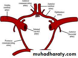 The middle cerebral artery is the largest terminal branch of the internal carotid artery and it runs laterally in the lateral cerebral sulcus of the brain. It supplies the entire lateral surface of the cerebral hemisphere except the narrow strip along the superolaterat margin (which is supplied by the anterior cerebral artery) and the occipital pole and inferolateral surface of the hemisphere (both of which are supplied by the posterior cerebral artery).Circle of Willis :
