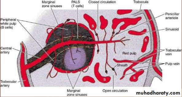Periarteriolar lymphoid sheaths (PALS), rich in T-lymphocytes