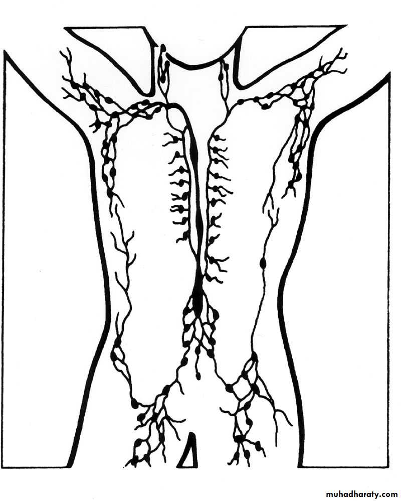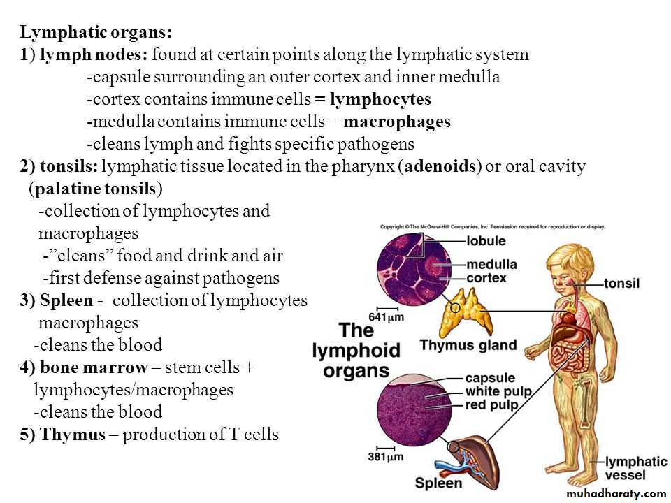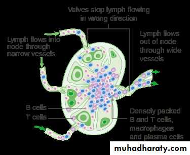 A thymoma is a tumor originating from the epithelial cells of the thymus that may be benign or malignant and frequently associated with the neuromuscular disorder, myasthenia gravis. The latter is a long term neuromuscular disease that leads to varying degrees of skeletal muscle weakness. The most commonly affected muscles are those of the eyes, face, and swallowing. It can result in double vision, drooping eyelids, trouble talking, and trouble walking. Onset can be sudden. Those affected often have a large thymus gland or develop a HYPERLINK "https://en.wikipedia.org/wiki/Thymoma" \o "Thymoma" thymoma. Thymoma is found in 20% of patients with myasthenia gravis.[2] Once diagnosed, thymomas may be removed surgically. In the rare case of a malignant tumor, chemotherapy may be used.2). Lymph nodes: or lymph gland, is an ovoid or kidney-shaped organ of the lymphatic system, and of the adaptive immune system, that is widely present throughout the body (Fig.4). They are linked by the lymphatic vessels as a part of the circulatory system. Lymph nodes are major sites of B and T lymphocytes, and other white blood cells. Lymph nodes are important for the proper functioning of the immune system, acting as filters for foreign particles and cancer cells. Lymph nodes do not have a detoxification function, which is primarily dealt with by the liver and kidneys. In the lymphatic system the lymph node is a secondary lymphoid organ.