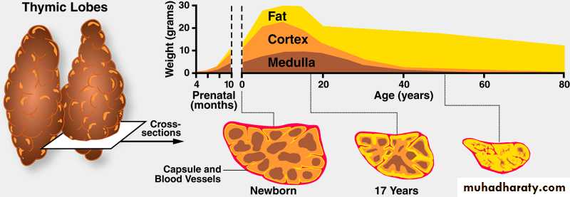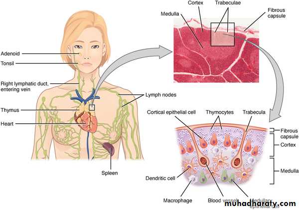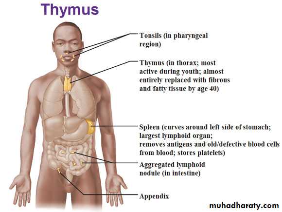 (1). Thymus: is a specialized primary lymphoid organ of the immune system and is an endocrine gland located behind the sternum above and front of the heart (Fig.1). Within the thymus, T-cells or T-lymphocytes mature. largest and most active during the neonatal and pre-adolescent periods. By the early teens, the thymus begins to atrophy and thymic stroma is mostly replaced by adipose (fat) tissue (Fig.2). Nevertheless, residual T- HYPERLINK "https://en.wikipedia.org/wiki/Lymphopoiesis" \o "Lymphopoiesis" lymphopoiesis continues throughout adult life. T cells are critical to the adaptive immune system, where the body adapts specifically to foreign invaders. The thymus is composed of two identical lobes and is located anatomically in the anterior superior HYPERLINK "https://en.wikipedia.org/wiki/Mediastinum" \o "Mediastinum" mediastinum, in front of the heart and behind the sternum.