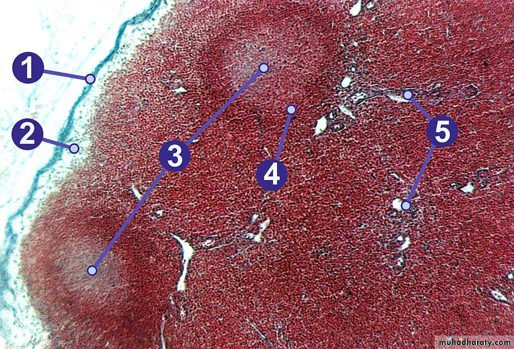 (Fig. 6): Section through a lymph node. 1) Capsule; 2) Subcapsular sinus; 3) Germinal centre; 4) Lymphoid nodule; 5) Trabeculae.