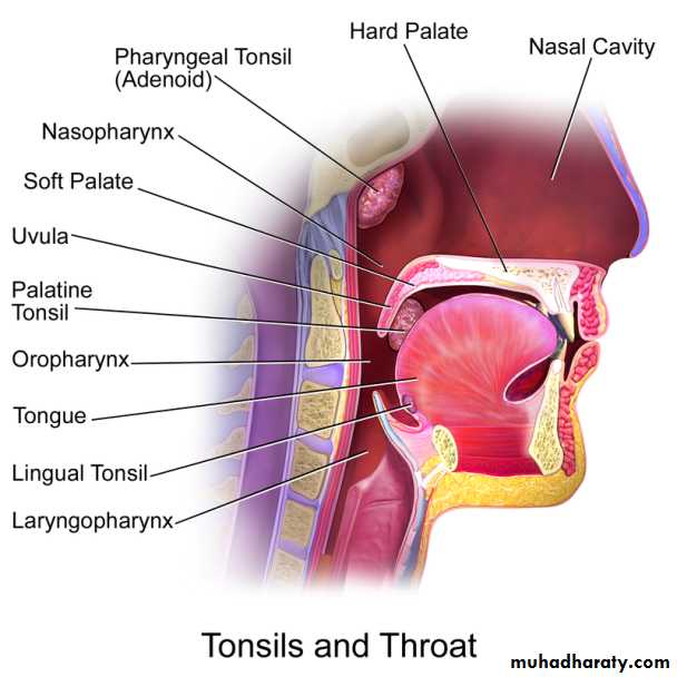 The palatine tonsils, are masses of lymphatic material situated at either side at the back of the human throat. The palatine tonsils and the nasopharyngeal tonsil are lymphoepithelial tissues located near the HYPERLINK "https://en.wikipedia.org/wiki/Oropharynx" \o "Oropharynx" oropharynx and HYPERLINK "https://en.wikipedia.org/wiki/Nasopharynx" \o "Nasopharynx" nasopharynx (parts of the throat). Tonsils tend to reach their largest size near puberty, and they gradually undergo atrophy thereafter. However, they are largest relative to the diameter of the throat in young children.