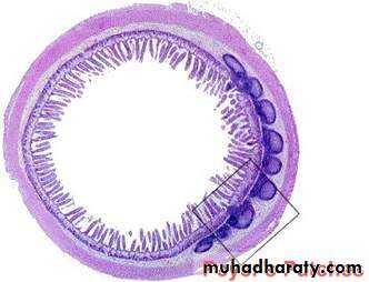 The Solitary lymphatic nodules (solitary follicles) are structures found in the small intestine and large intestine. The solitary lymphatic nodules are found scattered throughout the mucous membrane of the small intestine, but are most numerous in the lower part of the ileum. Their free surfaces are covered with rudimentary HYPERLINK "https://en.wikipedia.org/wiki/Intestinal_villus" \o "Intestinal villus" villi, except at the summits, and each gland is surrounded by the openings of the intestinal glands.
