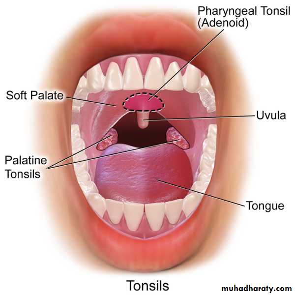 Tonsils are collections of lymphoid tissue facing into the aerodigestive tract. The set of lymphatic tissue known as HYPERLINK "https://en.wikipedia.org/wiki/Waldeyer%27s_tonsillar_ring" \o "Waldeyer's tonsillar ring" Waldeyer's tonsillar ring includes the adenoid tonsil, two tubal tonsils, two palatine tonsils, and the lingual tonsil.
