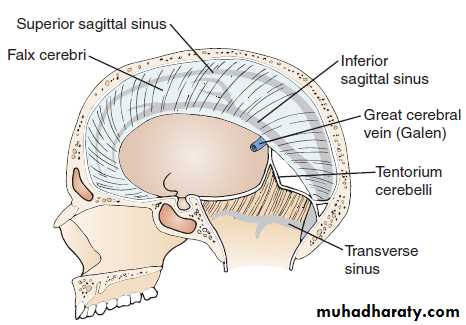 Figure: Cranial dura mater. The skull is open to show the falx cerebri and the right and left portions of the tentorium cerebelli, as well as some of the cranial venous sinuses