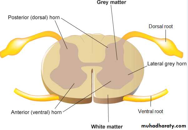 somewhat butterfly- or H-shaped in cross sections. The core consists mainly of two dorsal (posterior) horns, and two thicker ventral (anterior) horns. The right and left sides are connected by a gray commissure. In the middle of the