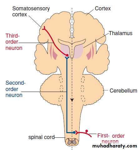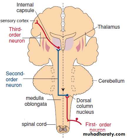 Figure: Neural pathway for discriminative touch and vibration. The pathway is a three-neuron chain. The fi rst-order neuron ascends in the dorsal column of the spinal cord; the second-order neuron crosses over the midline in the medulla, and the third-order neuron ascends from the thalamus to the somatosensory cortex..