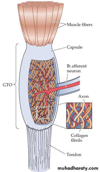 (length) and the speed with which muscle length is changing.2. Golgi tendon organs It is about 1 mm long and consists of an encapsulated tangle of knobby nerve endings entwined in the collagen fibers of the tendon. They are arranged in series with extrafusal muscles fibers. The sensory (afferent) fiber of golgi tendon are of type Ib fibers . When muscle contraction pulls on the tendon, the collagen squeeze the nerve endings between them. The nerve fiber sends signals to the spinal cord that provide the CNS with feedback on the degree of muscle tension at the joint. The Golgi tendon reflex is a response to excessive tension on the tendon. It inhibits α motor neurons to the muscle so the muscle does not contract as strongly to prevent tearing of muscle. The Golgi tendon reflex also functions when some parts of a muscle contract more than others. It inhibits the fibers connected with overstimulated tendon organs so that their contraction is more comparable to the contraction of the rest of the muscle. This reflex spreads the workload more evenly over the entire muscle, which is beneficial in such actions as maintaining a steady grip on a tool.
