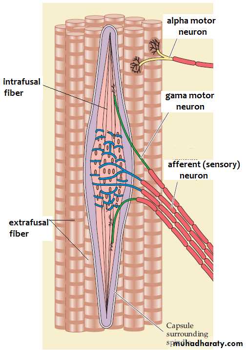 1. Primary afferent fibers(Ia), which end in annulospiral endings that coil around the middle of nuclear chain and nuclear bag fibers. These respond mainly to the onset of muscle stretch.