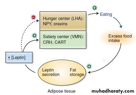 Plasma leptin concentration reflects the size of the total body fat store; there is a feedback loop in which high levels of body fat should increase leptin levels and decrease feeding. Patients who are obese are poorly responsive to leptin, which may contribute to the development and maintenance of overeating.