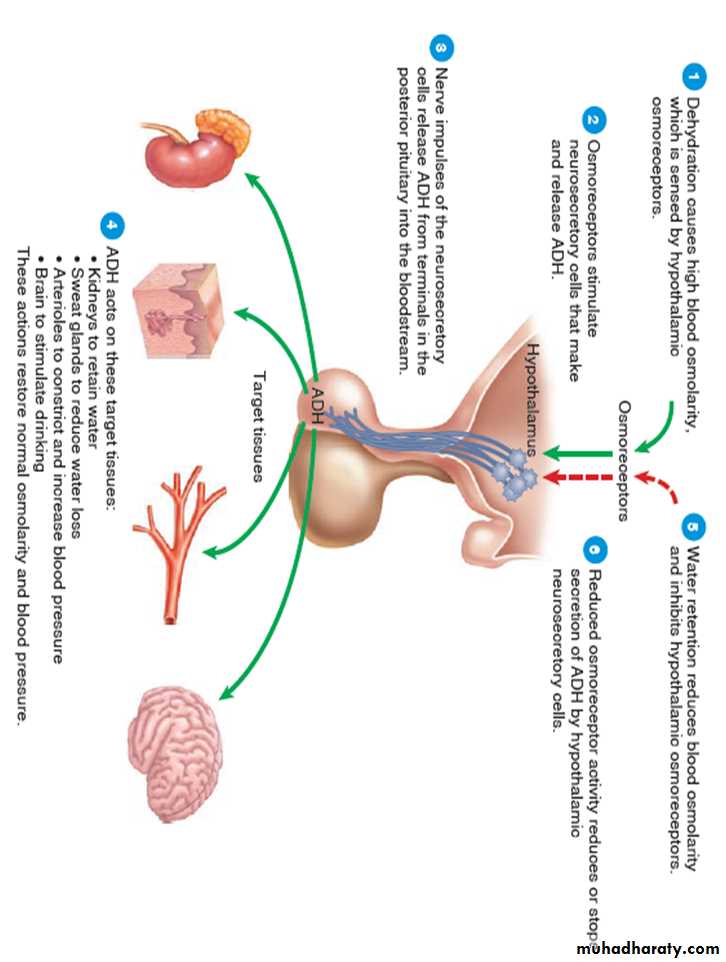 (2) by controlling the excretion of water into the urine, When the body fluids become too concentrated, the neurons of the supraoptic nuclei of the hypothalamus secrete ADH .This hormone is transported to the kidneys where it acts on the collecting ducts of the kidneys to cause increased reabsorption of water.