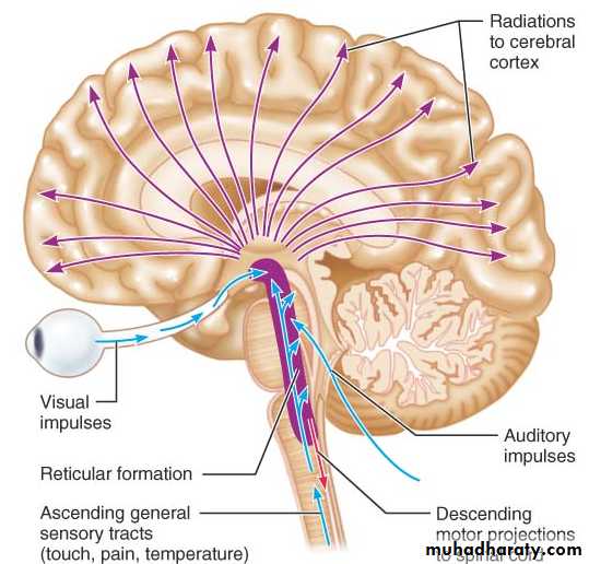 The central driving component of this system is an excitatory area located in the reticular substance of the pons and mesencephalon.This area transmits facilitory signals downward to the spinal cord to maintain tone in the antigravity muscles and to control levels of activity of the spinal cord reflexes. In addition to these downward signals, this area also sends a profusion of signals in the upward direction. Most of these go first to the thalamus, where they excite a different set of neurons that transmit nerve signals to all regions of the cerebral cortex as well as to multiple subcortical areas which inturn regulates level of brain arousal and consciousness.