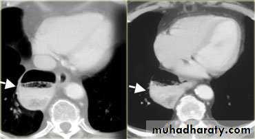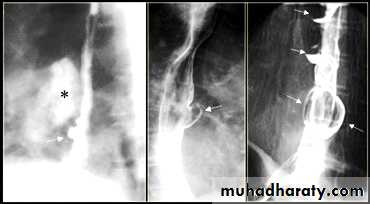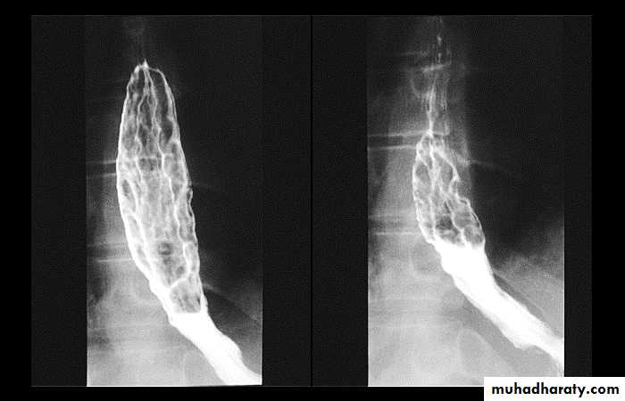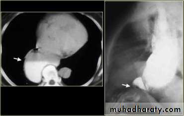 LEFT: Dilated esophagus (arrows) appears as long, well-defined structure paralleling heart RIGHT: Dilated esophagus usually deviates to right. Narrowing (arrow) at hiatus.