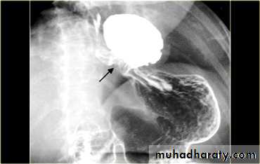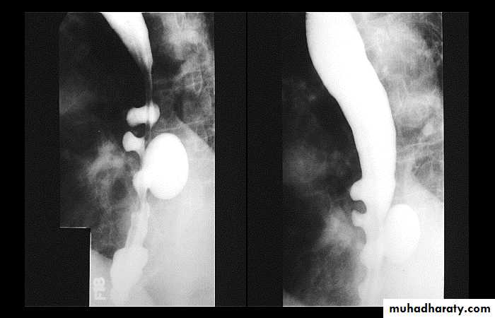 In the middle a pulsion diverticulum (arrow) due to high intra luminal pressure.