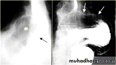 On the far left a traction diverticulum (arrow) due to hilar granulomatous disease. Calcified adenopathy (asterisk).
