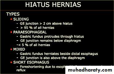 Sliding herniaOn the left initially, GE junction is below the esophageal hiatus. Later, stomach protrudes through hiatus