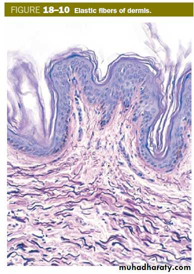 A section of thin skin stained for elastic fibers shows the extensive distribution of these darkly stained fibers among the eosinophilic collagen bundles. In the dermal papillary layer, the diameter of fibers decreases as they approach the epidermis and insert into the basement membrane. X100. Weigert