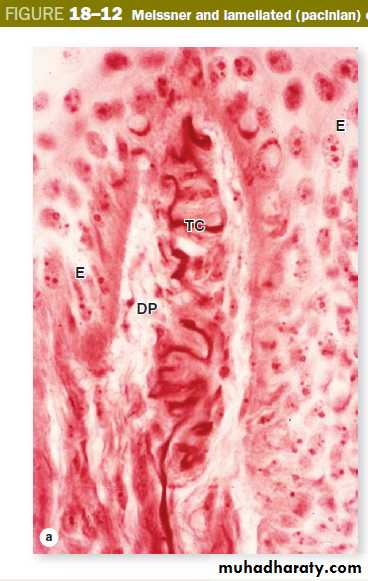(a) Meissner tactile corpuscles (TC) are specialized to detect light touch and are frequently located in dermal papillae (DP), partially surrounded by epidermis (E).