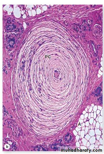 Lamellated (pacinian) corpuscles (PC) detect coarse touch or pressure and are large oval structures, frequently 1 mm in length, found among adipose tissue (A) deep in the reticular dermis or in the subcutaneous tissue. Here the outer connective tissue capsule surrounds 15-50 thin, concentric layers of modified Schwann cells, each separated by slightly viscous interstitial fluid. Several axons enter one end of the corpuscle and lie in the cylindrical, inner core of the structure. Movement or pressure of this corpuscle from any direction displaces the inner core, leading to a nerve impulse. X40. H&E.