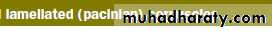 They are elliptical, approximately 150 μm long, with an outer capsule (from the perineurium) and thin, stacked inner layers of modified Schwann cells, around which course nerve fibers. X400. H&E.