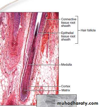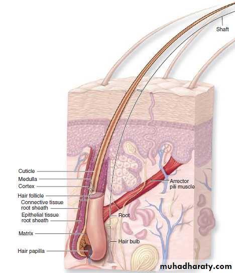 ■ The growing hair root is surrounded by internal and external root sheaths continuous with the epidermis, a glassy membrane formed in part by the basal lamina, and a connective tissue sheath .