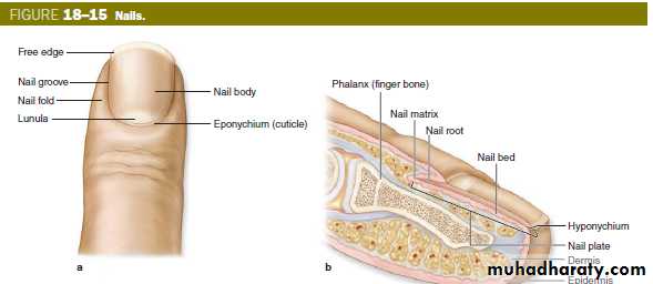 ■ Nails are formed in a manner similar to hairs: keratinocytes proliferate in the matrix of the nail root and differentiate with the formation of hard keratin as a growing nail plate with edges covered by skin folds.