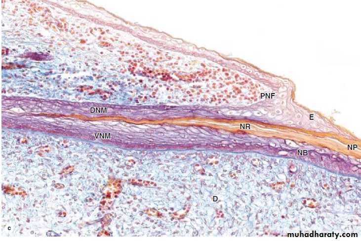 (c) A sagittal section from a finger shows the proximal nail fold (PNF) and its epidermal extension, the eponychium (E) or cuticle. The nail root (NR), the most proximal region of the nail plate (NP), is formed like the hair root by a matrix of proliferating, differentiating keratinocytes. These cells make up the dorsal nail matrix (DNM) and ventral nail matrix (VNM), which contribute keratinized cells to the nail root. The mature nail plate remains attached to the nail bed (NB), which consists of basal and spinous epidermal layers over dermis (D), but is pushed forward on this bed by continuous growth in the nail matrix. X100. Mallory trichrome.