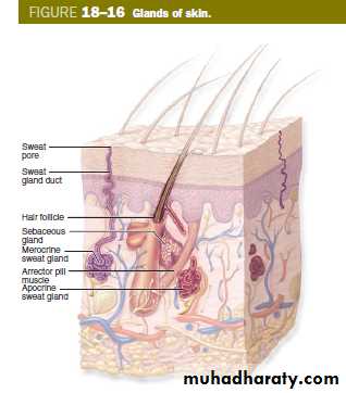 ■ Eccrine sweat glands in the dermis produce sweat that is mostly water onto the skin surface, where its evaporation provides an important mechanism for cooling the body.