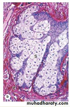 b) A micrograph shows the gland’s capsule (C) and differentiates sebocytes (S) at higher magnification. Proliferation of the small progenitor cells just inside the capsule continuously forces sebum into the ducts; myoepithelial cells are not present. X400. H&E