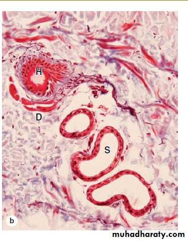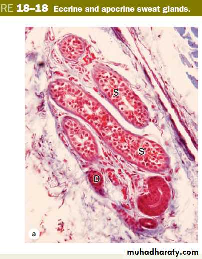 (b) Apocrine sweat glands, which roduce a more protein-rich secretion with pheromonal properties, are characterized by secretory portions (S) with lumens much larger than those