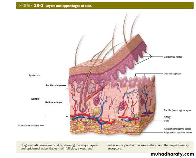 ■ Sensory receptors in the epidermis include free nerve endings , which detect pain and temperature extremes, and basal Merkel cells , light-touch (tactile) receptors associated with sensory fibers.■ Other cutaneous sensory structures include Meissner corpuscles ,