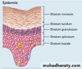 friction, and microbial invasion, and consists of flattened, terminally differentiated cells, or squames , which are slowly lost.4) The stratum lucidum, found only in thick skin, consists of a thin, translucent layer of flattened eosinophilic keratinocytes