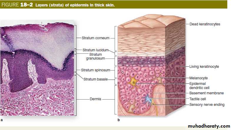 • Micrograph & Diagram ( b) illustrating the sequence of the epidermal layers also indicates the normal locations of three important nonkeratinocyte cells in the epidermis: melanocytes, a Langerhans cell, and a tactile Merkel cell.