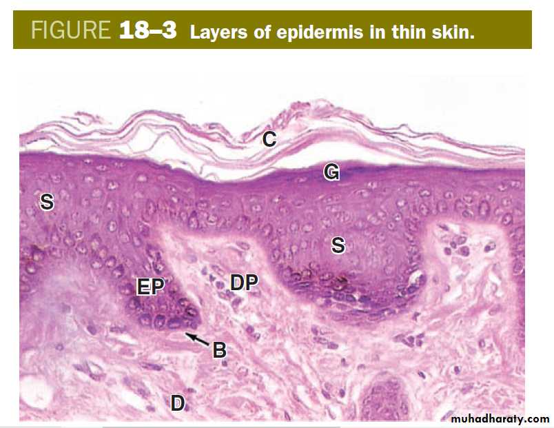 The interface between dermis and epidermis in thin skin is held together firmly by interlocking epidermal ridges or pegs (EP) and dermal papillae (DP). The dermis (D) of thin skin is more cellular and well vascularized than that of thick skin, with elastin and less coarse bundles of collagen. The epidermis usually shows only four layers in thin skin: the one-cell thick stratum basale (B) containing most mitotic cells; the stratum spinosum (S) where synthesis of much keratin and other proteins takes place; the stratum granulosum M(G); and the stratum corneum (C), onsisting of dead squames composed mostly of keratin. X240. H&E.