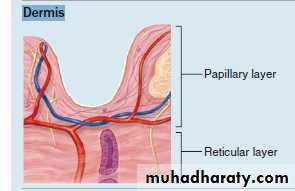More superficial layer of dermis; composed of areolar connective tissue; forms dermal papillae; contains subpapillary vascular plexusB) Reticular layer