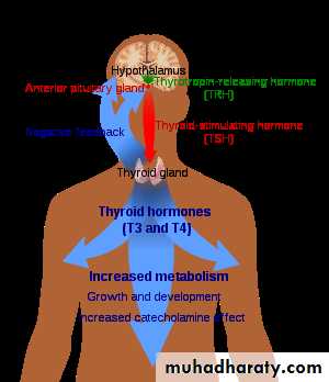 The hypothalamus produces Thyroid Releasing Hormone (TRH) that signals the pituitary to tell the thyroid gland to produce more or less of T3 and T4 by either increasing or decreasing the release of a hormone called thyroid stimulating hormone (TSH).