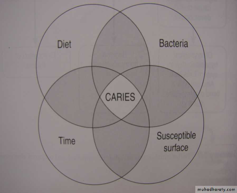 Dental caries – a multifactorial disease – interplay of 3 primary factors plus time also.Mere presence of bacteria and a suitable substrate on a tooth surface at a given time is not enough to cause caries.