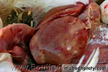 HE virus causes dark red/black discolouration of intestines which are often blood filled. Enlargement of the spleen is a feature of serogroup 2 viruses at post-mortem, with a mottled and friable appearance and congestion of the lungs and liver. The white pulp of the spleen is hyperplastic histologically and intranuclear inclusion bodies form islands within the tissue structure.