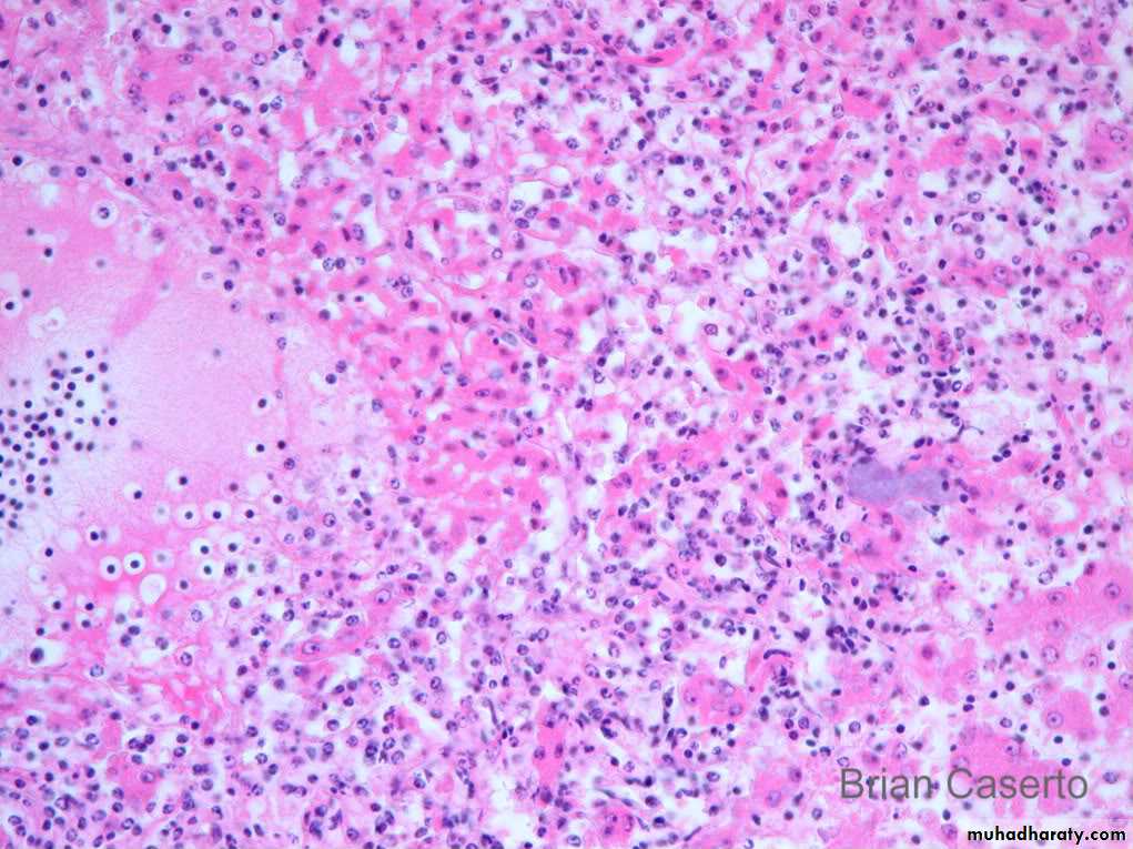 In IBH, the liver is enlarged, friable and discoloured pale yellow-brown with surface haemorrhage, histological necrosis and again, intranuclear inclusion bodies which may be eosinophilic or basophilic.