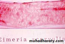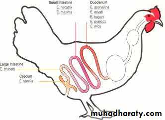 E. acervulina and E. maximaBoth species develop in epithelial cells, primarily in the upper part of the small intestine. They cause subclinical coccidiosis associated with marked weight loss.