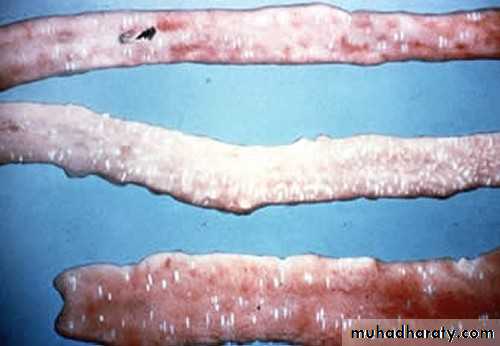 Greyish-white foci in the intestine caused by E. necatrix