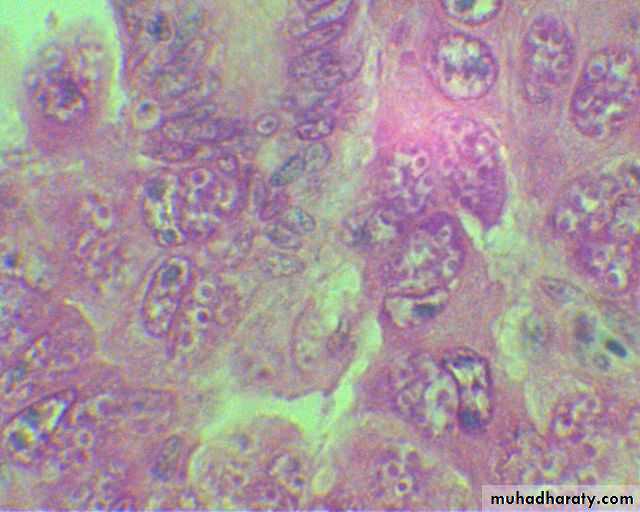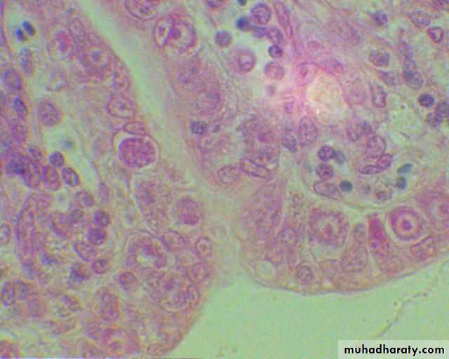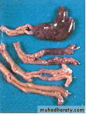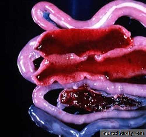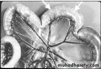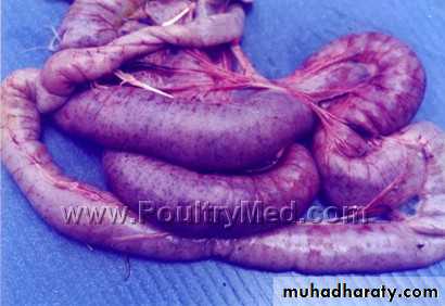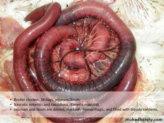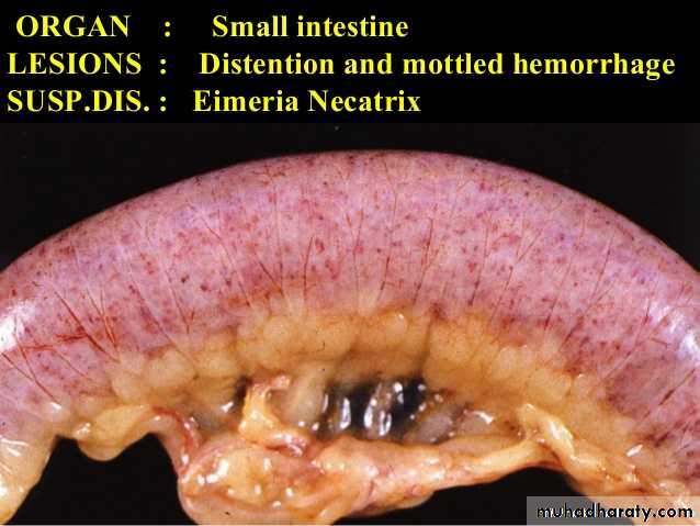 E. acervulina is less pathogenic than E. tenella or E. necatrix. E. acervulina is responsible for subacute or chronic intestinal coccidiosis in broilers, older birds and chickens at the point of lay. The clinical signs consist of weight loss and a watery, whitish diarrhea. At postmortem, greyish-white, pinpoint foci or transversely elongated areas are visible from the outer (or serous) surface of the upper intestine. The foci consist of dense areas of oocysts and gamete (male and female sex cells) production.E. maxima produces few marked changes in the small intestine until the fifth day after infection. After that time in severe infections, numerous small hemorrhages occur along with a marked production of thick mucus. The intestine loses tone and becomes flaccid and dilated. The inner surface is inflamed, and the intestinal content consists of a pinkish mucoid secretion.
