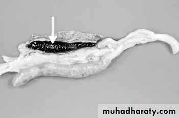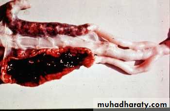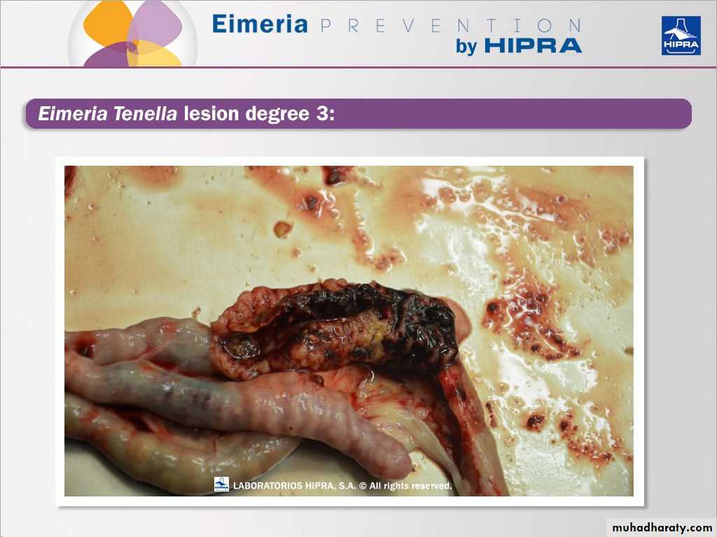 Coccidiosis caused by E.tenella developing in the ceca. The arrow indicates the cecal core