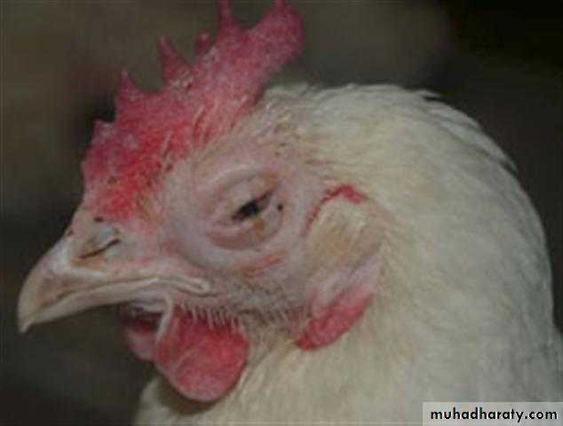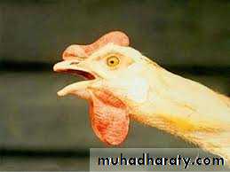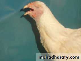 In the acute form, gasping, coughing, rattling, and extension of the neck during inspiration are seen 5–12 days after natural exposure.Reduced productivity is a varying factor in laying flocks. Affected birds are anorectic and inactive. The mouth and beak may be bloodstained from the tracheal exudate.