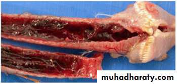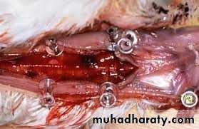 The acute disease is characterized by the presence of blood, mucus, yellow caseous exudates, or a hollow caseous cast in the trachea.Microscopically, a desquamative, necrotizing tracheitis is characteristic of acute disease.