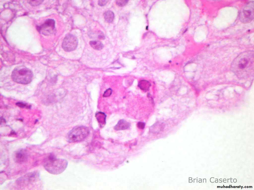 Microscopic examination of the chorioallantoic membrane lesion shows intranuclear inclusions. On microscopic examination of the trachea, intranuclear inclusion lesions produced by ILTV infection must be differentiated from the diphtheritic form of fowlpox infection that produces intracytoplasmic inclusions.